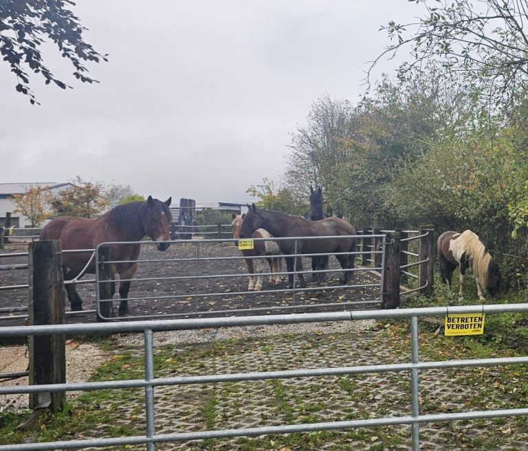 Weitläufiger Paddock mit überdachter Heuraufe und freiem Zugang zu großen Boxen mit winterfester Tränke